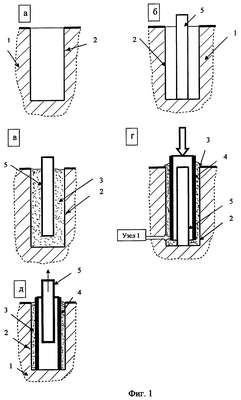 – По способу 1: В многолетнемерзлом грунте 1 пробуривают скважину 2 (фиг.1а), в которую опускают инвентарную вставку 5 (фиг.1б). В пространство между стенками скважины 2 и инвентарной вставки 5 засыпают рыхлый грунт 3, например песок (фиг.1в). Сваю 4 погружают в грунт 3 забивным, вибрационным, ударновибрационным, вращательным или другими способами (фиг.1г). Непосредственно после погружения сваи инвентарную вставку 5 удаляют из скважины с установленной сваей 4 (фиг.1д).