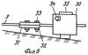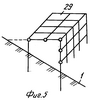 На фиг.5 показана Г-образная платформа 29, которую устанавливают на откосе 1, вдавливая частично ее вертикальные стержни в грунт откоса и предавая верхней площадке платформы горизонтальное положение. Такие платформы устанавливают для двух рабочих. Далее приступают к установке оборудования для забивки элемента 9 в грунт. Для этого забивной элемент 9 укладывают на откос 1 и на один его конец одевают кольцевой молот 30, а на другой конец на некотором расстоянии от него закрепляют боек 31, фиксируя положение бойка на забивном элементе 9 с помощью гаек 32 на болтах 33. При этом углубление для головок болтов 33 в одной из симметричных жестких пластин бойка 31 препятствует их проворачиванию. Для вращения гаек 32 используют накладные ключи. После этого рабочие 36 за ручки 35 поднимают кольцевой молот 30 с забивным элементом 9 и бойком 31 и устанавливают его наклонно или вертикально на грунт так, чтобы нижний конец забивного элемента 9 оказался в заданной точке на поверхности грунта, как это показано на фиг.7. После чего рабочие 36 (показаны условно вертикальной линией) становятся на горизонтальную часть платформы 29 и, поднимая кольцевой молот 30 за ручки 35 и придавая ему руками ускорение, дополнительное к ускорению силы тяжести, с силой ударяют по бойку 31, который вместе с забивным элементом 9 перемещается вниз и забивной элемент 9 погружается в грунт. После того, как нижний торец бойка 31 окажется вблизи поверхности грунта, рабочие 36 за ручки 35 поднимают кольцевой молот 30 вверх относительно забивного элемента 9 и фиксируют его положение с помощью стопорного болта 34, после чего гайки 32 разворачивают и боек 31 перемещают вверх по забивному элементу 9 и фиксируют его положение гайками 32 и т.д. При этом большее поперечное сечение осевого отверстия у торцов кольцевого молота 30, чем в средней его части, уменьшает силу трения забивного элемента 9 по поверхности осевого отверстия кольцевого молота 30.