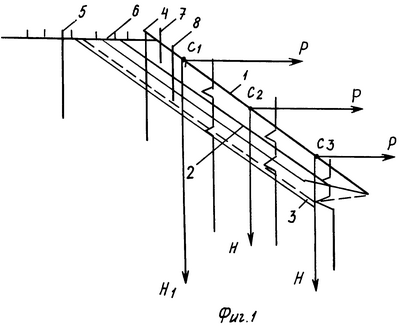 Для достижения этой цели на откосах с углом наклона  1° к горизонту инженерно-геологическое обследование откосов и установление положения поверхности скольжения откоса по глубине производят путем зондирования грунта откоса с использованием легкого ручного зонда, например зонда РЗГ – “Русский зонд” (3), путем определения по результатам зондирования минимальных значений Рmin – сопротивление грунта зондированию в каждой скважине зондирования, расположенных примерно в створе, перпендикулярному бровке откоса и его подошве, а изменчивость положения значений Рmin по глубине для данной поверхности скольжения определяется по формуле: , где hmax и hmin соответственно максимальное и минимальное значение глубины положения Pmin в створе откоса для данной поверхности скольжения откоса, при этом если по результатам зондирования грунта откоса принято решение о необходимости наблюдений за его деформациями, то устраивают реперную систему из забивных элементов, например арматурных стержней, состоящую из реперов и марок, при этом забивные элементы реперов, расположенные на откосе, забивают на глубину h1, определяемую по формуле: