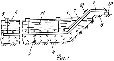 После полной отработки продуктивной толщи сапропеля 4 по глубине изменением положения хвостовой части 3 скребкового конвейера в вертикальной плоскости скребковый конвейер поворачивают в горизонтальной плоскости относительно головной части 7 (бункера 20), благодаря чему отрабатывается продуктивная толща сапропеля 4 в пределах сектора поворота.