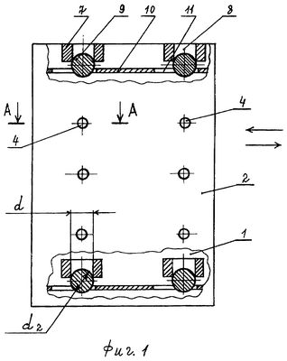 Ригель содержит подвижную и неподвижную части сообщенные между собой, причем подвижная часть образована головкой и хвостовиком, которые скреплены друг с другом и включает: листы 1, 2 (см. фиг.1, 2) с краями и сквозными отверстиями 14 (см. фиг.4) (сквозные отверстия 14 выполнены на листе 2 и аналогичные сквозные отверстия выполнены на листе 1, но условно поз. не обозначены в силу очевидности), полость 3 толщиной, равной h1, крепежные изделия 4, 5, скрепленные друг с другом и образующие соединения винт-гайка, причем крепежные изделия 5 являются гайками со сквозными отверстиями 13 (они необходимы для захвата и последующего поворота крепежного изделия), а крепежные изделия 4 являются винтами, распорные втулки с торцевыми поверхностями 6, которые имеют длину, равную h1 и толщину, равную d1, опорные элементы 7 со сквозными отверстиями 8 с диаметром, равным d, и фиксаторы 15 (см. фиг.3, их может и не быть), накладные элементы 16, 17 и паз 18 шириной, равной h7, а неподвижная часть образована корпусом 10 (см. фиг.1-3) со сквозными отверстиями 12, каждое из которых имеет высоту, равную h6, и ширину, равную h5, с направляющей, причем направляющая образована в виде отдельных отверстий 11 (см. фиг.1, 3, 6) длиной, равной h4, и шириной, равной h3 (на корпусе 10, в качестве примера, показано четыре отверстия 11). Корпус 10 образован в виде, по меньшей мере, двух вертикальных стоек, выполненных, преимущественно, из труб, которые отстоят друг от друга на некотором расстоянии и скреплены друг с другом посредством горизонтально ориентированных соединительных элементов, выполненных, преимущественно, из швеллеров или труб, на которых выполнены сквозные отверстия 12. Ригель содержит в своем составе элементы трения качения или/и элементы трения скольжения 9 (на фиг.1 в качестве указанных элементов, для примера, показаны элементы трения качения, образованные шарами (шариками) с диаметром, равным d2. Наибольший практический интерес представляют элементы трения скольжения (на фиг.1 их показано четыре штуки) с точки зрения эффективности эксплуатации ригеля и срока службы указанного изделия. В качестве элементов трения могут быть использованы стандартизованные шарики или ролики, как элементы подшипников качения. В качестве элементов трения скольжения могут быть использованы ролики, размещенные вдоль направления перемещения подвижной части ригеля, при этом ролики не будут вращаться и они будут реализовывать процесс трения скольжения. В конструкции ригеля могут быть использованы одновременно элементы трения скольжения и трения качения, например два ролика и два шарика, в этом случае будут одновременно реализовываться процессы трения скольжения и трения качения. Таким образом, заявителем доказана возможность использования в формуле изобретения словесной конструкции “или/и”.