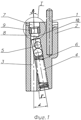 Продольные оси входной полости 7 и предохранительной камеры 8 смещены относительно оси пропускного канала 3 и входная полость 7 расположена под углом к пропускному каналу таким образом, что острый угол , образованный между осью пропускного канала 3 и осью наклонной полости 4, превышает острый угол , образованный между осью наклонной полости 4 и осью входной полости 7.