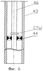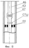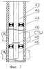 Следует отметить (см. фиг.1), что стопор 18, размещенный в радиальных каналах 15 ствола 10, может быть при сборке СТШ установлен в муфте 6, расположенной сверху (также может быть снизу или посередине и пр.) корпуса 1 для обеспечения либо телескопического хода только в одну сторону либо дискретного изменения телескопического хода вверх и соответственно вниз в зависимости от характеристик и параметров скважины. В частном случае в СТШ может быть вынут стопор 18 из корпуса 1. При этом корпус 1 и ствол 10 относительно друг друга будут иметь свободный телескопический ход даже при исходном положении СТШ, например ниже насоса 47 в скважине 43 (см. фиг.8), для снятия динамических нагрузок при работе насоса 47. Кроме того, СТШ спускается в скважину 43 на колонне труб 46 между двумя пакерами 44 и 45 (см. фиг.7), в частности для возможности отдельного срыва верхнего пакера 44, а затем пакера 45 за счет телескопического хода вверх.