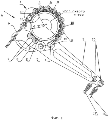 – плашкодержатели вместе с плашками выполнены самоустанавливающимися на трубе как за счет гибкости ленты или канатов, так и за счет придания соответствующей конфигурации их опорным поверхностям.