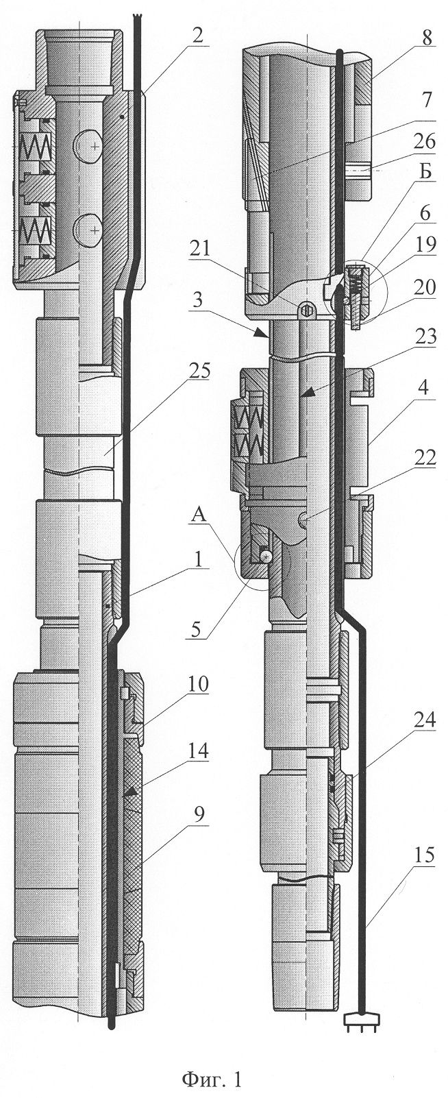 Ствол 1 может быть соединен с гидравлическим якорем 2 через патрубок или трубу 25 (см. фиг.1) для удобства направления кабеля 15 через продольный глухой канал 14 ствола 1 (в том числе и гидравлического якоря 2) пакера.