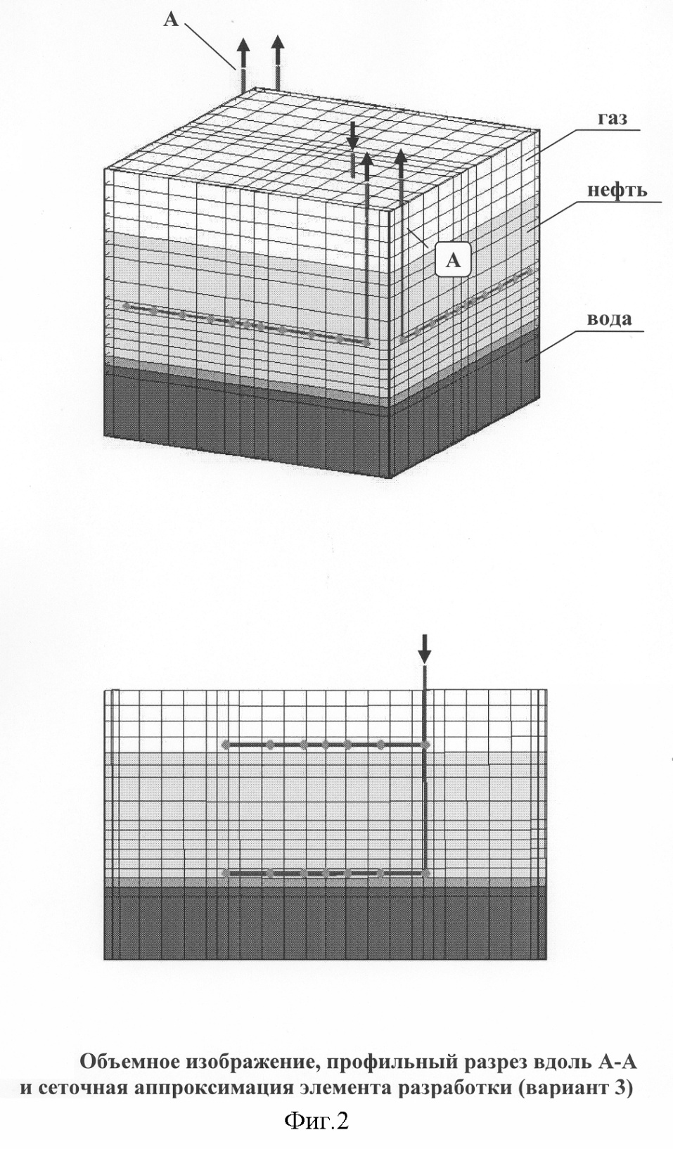 Вариант 2. Назначение данного варианта заключается в оценке значимости способа согласно прототипу. Он предусматривает разнесение по вертикали горизонтальных добывающих и нагнетательного стволов. Расчетная схема аналогична фиг.2, за исключением горизонтального нагнетательного ствола над газонефтяным контактом. Горизонтальные добывающие стволы располагают в пятом нефтеносном прослое, а горизонтальный нагнетательный ствол – в 10-м нефтеносном прослое.