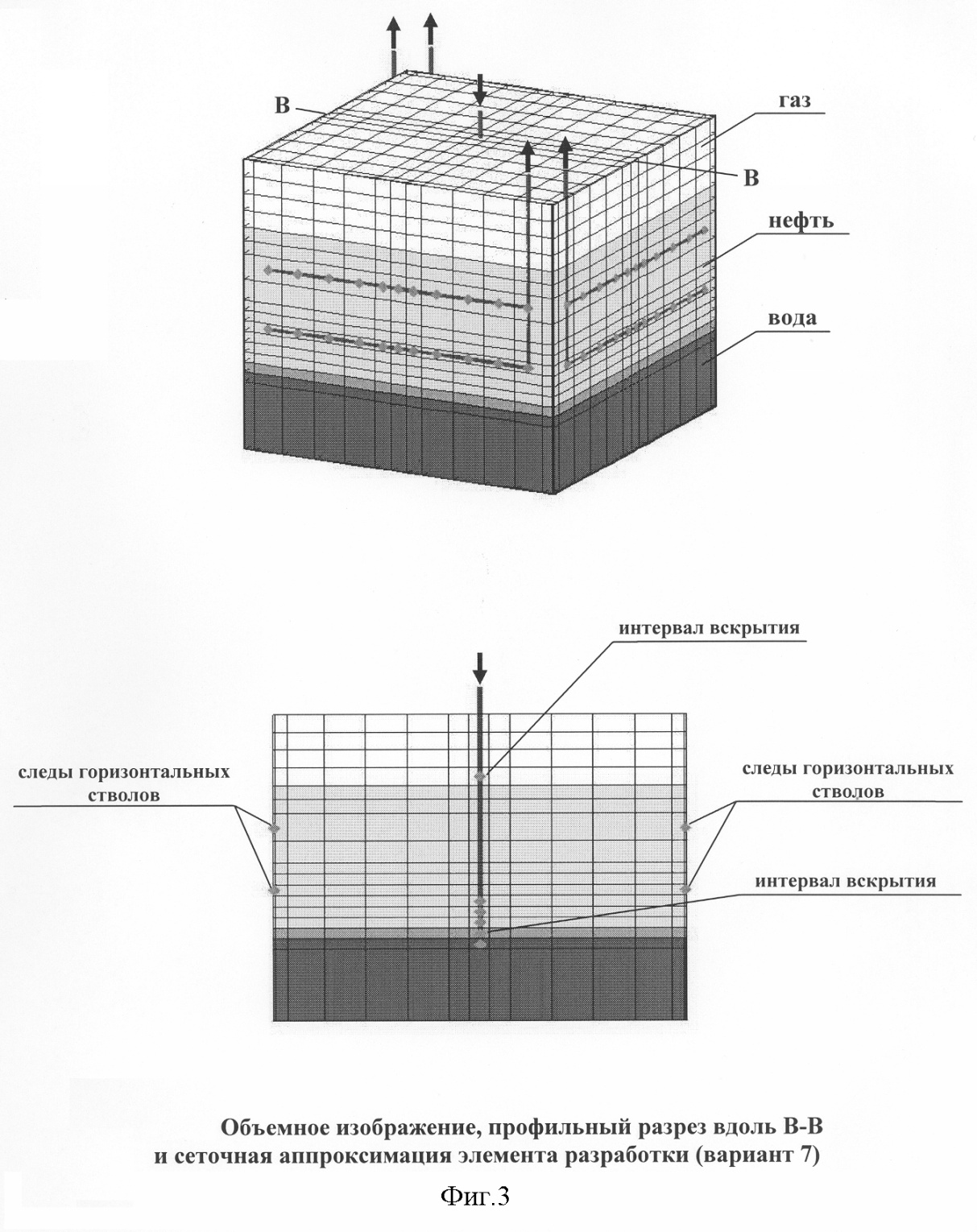 Вариант 7. Данный вариант, по сравнению с предыдущим, исследует целесообразность двухстадийного разбуривания элемента разработки с целью дальнейшей интенсификации добычи нефти. На первом этапе горизонтальные добывающие стволы размещают в 7-м нефтеносном прослое. На 10-м году забуривают горизонтальные стволы второго этапа разбуривания в 3-м нефтеносном прослое (см. фиг.3).