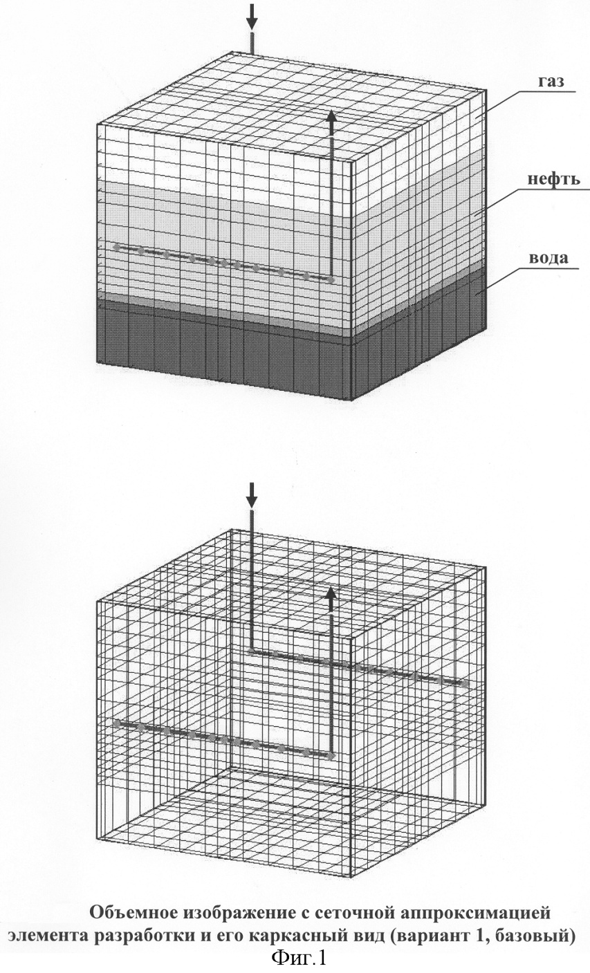 3D математические эксперименты проводились на пятиточечных площадных элементах разработки, представленных на фиг.1-3. Соответствующие расчеты выполнялись численно в 3D трехфазной (газ-нефть-вода) постановке. Во всех вариантах расчетный элемент разработки имеет площадные размеры 200×200 м и принят послойно неоднородным по коллекторским свойствам. Соответствующие исходные данные приводятся в табл.1.