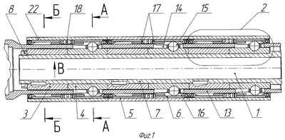 При работе редуктора 1 в каждый момент времени часть шариков 15 находится в рабочих канавках 9 и 11 и передает крутящий момент через ролики 16 на водило 13, а часть шариков 15 находятся в канавках возврата 10 и 12 и не передают крутящий момент. Так как каждый последующий ряд окон 14 в водиле 13 смещен относительно предыдущего в окружном направлении на 25,2°, то вследствие этого 60% времени крутящий момент передают 30 шариков, а 40% времени – 28 шариков. Таким образом, увеличено минимальное количество передающих крутящий момент шариков с 24 до 28 и снижены контактные напряжения. При работе редуктора в каждый момент времени часть шариков 15 катятся по канавкам возврата 10 и 12 и не должны передавать крутящий момент на водило 13. Однако при этом возможно заклинивание шариков между канавками 9 и 11 внутренних обойм и рабочей поверхностью окон 14 в водиле 13. Для исключения заклинивания шариков в конструкции редуктора предусмотрены заглушки 20, установленные в продольных пазах внешних обойм 5 и 6, которые принудительно выводят шарики из контакта с водилом. В процессе работы ролики 16 центрируются по наружной поверхности внутренних обойм и внутренней поверхности внешних обойм. Для предотвращения перекоса роликов при прохождении канавок возврата 10 и 12 в продольных пазах внешних обойм установлены вкладыши 21. Для обеспечения разворота в окружном направлении внешних обойм друг относительно друга используется набор регулировочных шпонок 23.
