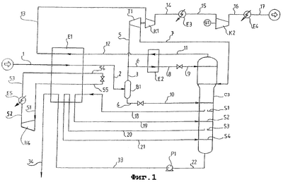 Первый поток из головной части 3 является предпочтительно газообразным, первый поток из нижней части – предпочтительно жидким, а их соответствующие выходы составляют приблизительно 27000 и 3000 кгмоль/час.
