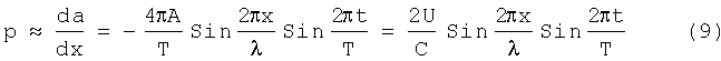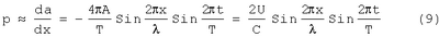 Обратимся теперь к вопросу о распределении давления в стоячей волне. В волне, распространяющейся в направлении сил оси х, давление р пропорционально изменению смещения вдоль х, т.е. величине da/dx. Дифференцируя выражение (7) по х, получим