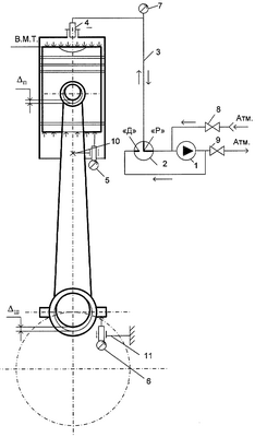 Установка состоит из вакуум-компрессора 1, двухходового пробкового вентиля 2, металлорезинового рукава 3, переходного патрубка 4, устанавливаемого вместо форсунки или свечи зажигания, измерительного индикатора 5 для фиксации величины перемещения поршня, измерительного индикатора 6 для фиксации величины перемещения шатуна, указателя давления и разрежения 7, перепускных вентилей 8, 9 и приспособлений 10, 11 для установки индикаторов 5, 6.