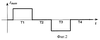 В циклах измерения источник тока 7, управляемый микропроцессором 10 совместно с ШИМ-регулятором 8, возбуждает с помощью катушек 2 магнитное поле в расходомере. Возбуждение магнитного поля осуществляется двухполярным прямоугольным сигналом тока с заданным значением и повторением одного цикла (фиг.2), состоящего из периодов: Т1 – возбуждение магнитного поля, Т2 – пауза, Т3 – возбуждение магнитного поля другой полярности по сравнению с периодом Т1, Т4 – пауза. Двухполярный сигнал необходим для исключения эффекта поляризации электродов, а соответственно и уменьшения погрешности измерения. Выборка сигналов напряжений, снимаемых с электродов трубопровода 3 и дополнительного трубопровода 5, осуществляется в моменты времени, когда индукция магнитного поля имеет стабильное значение.