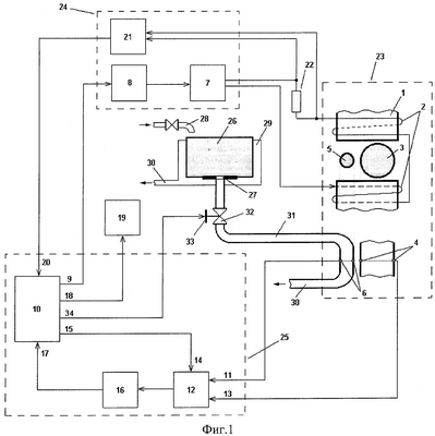 Для коррекции мультипликативной составляющей погрешности измерения электромагнитного расходомера используется источник постоянного расхода жидкости. Постоянный расход обеспечивается постоянным давлением в дополнительном трубопроводе 5 с постоянным сечением. Постоянное давление устанавливают с помощью поддержания постоянной высоты столба жидкости в емкости 26 с выходным трубопроводом 27. Уровень столба измеряемой среды в емкости 26 поддерживается с помощью подпиточного трубопровода 28, расход которого больше расхода дополнительного трубопровода 5, а излишки измеряемой среды переливаются через край емкости в сливную емкость 29, к которой подсоединен сливной трубопровод 30 для отвода излишков измеряемой среды. Таким образом, постоянный расход поддерживается высотой столба измеряемой среды, а высота столба ограничена верхней кромкой емкости 26. Емкость 26 соединена с помощью трубопровода 31 через управляемую задвижку 32 с дополнительным трубопроводом 5. Задвижка 32 управляется исполнительным механизмом 33, соединенным в свою очередь с выходом 34 микропроцессора 10. Электроды 6 дополнительного трубопровода 5 установлены на горизонтальном участке сливного трубопровода 30.