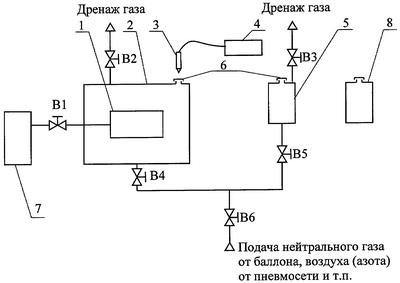 На схеме изображено: 1 – изделие, 2 – испытательная камера, 3 – щуп течеискателя, 4 – течеискатель, 5 – дополнительная камера; 6 – патрубки с заглушками для ввода щупа, 7 – пневмопульт для подачи контрольного газа, 8 – емкость с эталонной концентрацией, B1…В6 – вентили.
