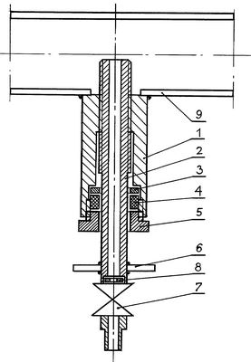 Предложенное техническое решение изображено на чертеже, где 1 – корпус пробоотборника, 2 – пробоотборная трубка, соединенная с корпусом 1 резьбовой парой с шагом Р так, что длина этой резьбы на пробоотборной трубке больше длины ответной резьбы в полости корпуса на величину внутреннего диаметра трубопровода 9. Сальниковое устройство состоит из шайбы перекрытия 3, сальникового материала 4 и прижимной втулки 5. Поворотная ручка 6 служит для поворота трубки 2 относительно неподвижного корпуса 1. Шайба-штуцер 8 и шаровой вентиль 7 обеспечивают постоянство диаметра отверстия истечения жидкости и газа из трубопровода в пробоотборную камеру.