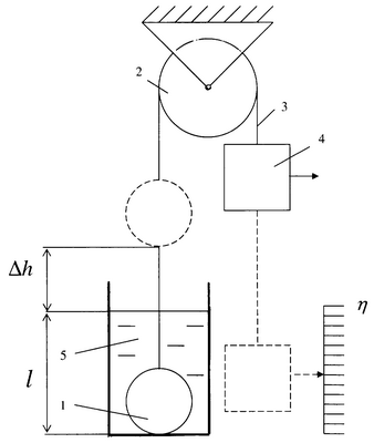 Предлагаемый способ осуществляется следующим образом. Чувствительный элемент в виде шарика 1, соединенного перекинутой через блок 2 гибкой нитью 3 с находящимся в воздухе противовесом 4, помещают в измеряемую вязкую среду 5 и регистрируют перемещение шарика, шарик и противовес выполняют одинаковой массы, что обеспечивает их уравновешивание в воздухе; шарик погружают в жидкость на определенную глубину l и разгоняют вверх под действием силы Архимеда. Таким образом, у поверхности жидкости шарик будет обладать кинетической энергией, которая при дальнейшем движении шарика в воздухе расходуется на работу по преодолению силы трения в блоке до его полной остановки, в результате этого в воздухе шарик подпрыгивает на высоту h над поверхностью жидкости. После этого измеряют h, по величине которой судят о вязкости следующим образом: чем меньше вязкость жидкости, тем до большей скорости шарик разгонится и тем на большей высоте остановится в воздухе без каких-либо колебаний.