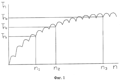 На фиг.1 представлен общий вид термограммы, полученной по датчику температуры, расположенному в плоскости контакта теплоизолятора и исследуемого пенополиуретана на фиксированном расстоянии от линии действия нагревателя при воздействии тепловыми импульсами постоянной мощности и постоянным периодом следования. На термограмме показаны температуры Tn1, Tn2 и Tn3 в моменты подачи n1, n2 и n3 импульсов.