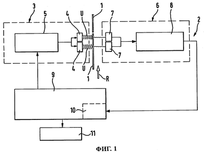 Это контрольное устройство 2 имеет устройство 3 излучения ультразвука и устройство 6 приема ультразвука. В рассматриваемом варианте устройство 3 излучения ультразвука состоит из нескольких излучателей 4 и блока 5 управления, который управляет этими отдельными излучателями 4. Устройство 6 приема ультразвука также состоит из одного или нескольких приемников 7, каждый из которых соединен с блоком 8 управления ими, в который поступают измеряемые этими приемниками 7 значения.