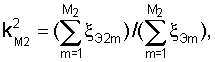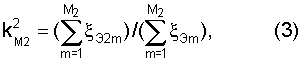 – на третьем этапе для известного вида сигналов, создающих ЭМИ ЭВМ (непрерывный пилообразный сигнал, последовательность прямоугольных или треугольных импульсов и т.п.) по известным формулам для их частотного энергетического спектра [9] рассчитывают коэффициент k2 M2 (относительный энергетический «вес» М2 выделенных гармоник в суммарном спектре М гармоник ЭМИ ЭВМ) по формуле