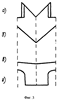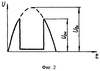 Форма этих импульсов показана на фиг.2 (пунктирная линия). Когда напряжение импульсов достигает порога срабатывания регулятора напряжения, его выходной транзистор закрывается, напряжение на клемме Ш повышается и транзистор усилительного каскада 6 открывается, и напряжение на выходе усилительного каскада 6 уменьшается до напряжения насыщения транзистора, а когда напряжение импульса спадает до напряжения отпускания регулятора, напряжение на выходе усилительного каскада 6 вновь возрастает. И на выходе усилительного каскада 6 будут чередоваться импульсы напряжения, амплитуда которых будет равна напряжению срабатывания и напряжению отпускания регулятора напряжения (в случае, если они отличаются). На фиг.2 импульсы показаны сплошной линией. При этом вольтметр пиковых значений 7 регистрирует напряжение срабатывания регулятора напряжения. Одновременно импульсы с выхода усилительного каскада 6 поступают на вход усилителя сигналов 9 осциллографического устройства 8, и на экране последнего будут наблюдаться фигуры Лиссажу в зависимости от состояния регулятора напряжения. При исправном регуляторе напряжения будут наблюдаться зеркально-симметричные треугольные импульсы (фиг.3а), амплитуда которых соответствует напряжению срабатывания регулятора напряжения. Если напряжение отпускания регулятора меньше напряжения срабатывания, то на импульсах будет наблюдаться две вертикальных линии, длина меньшей будет определять напряжение отпускания регулятора напряжения, при наличии колебательных процессов в регуляторе напряжения количество вертикальных линий еще увеличивается.