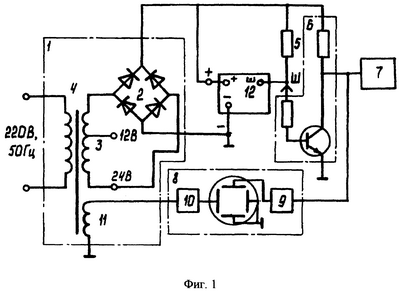 При подключении устройства к сети на вход регулятора напряжения 12 подаются импульсы напряжения с выпрямителя 2. Амплитуда этих импульсов определяется действующим напряжением вторичной обмотки 3 трансформатора 4, которое должно быть 12 В для регуляторов напряжения, настроенных на 14 и 24 В для 28-вольтовых регуляторов. На обмотке 3 имеются соответствующие выводы.