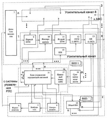 Блок управления передающей системой 16 частотозадающим выходом подсоединен к входу управления возбудителя 5, синхронозадающим выходом – к входу синхронизатора 4, имеющего второй выход, соединенный, для опережения по времени по отношению к генерированию зондирующих импульсов функционирования общего 14 и канальных 15 ИМ в режиме временной синхронизации коммутации мощности в первом 9 и втором 11 БУМ и ОУМ 12 в усилительных каналах 8, с третьим входом блока управления передающей системой 16, который синхроамплитудозадающим выходом соединен, для указанной синхронизации и стабилизации уровня выходной мощности в БУМ 9 и 11, с входом общего ИМ 14.