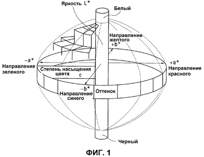 На Фиг.1 представлен концептуальный вид цветового тела представляющей цвета L*a*b* системы, применяемой в вариантах реализации согласно настоящему изобретению;