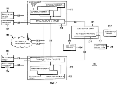 На Фиг. 1 примерный беспроводной сервер 110 обеспечивает доступ к услуге различным беспроводным клиентам 122, взаимодействующим с использованием протокола клиент-сервер (CSP) и беспроводным клиентам 124, взаимодействующим с использованием протокола с интерфейсом типа командной строки (CLI). Другие клиенты, включая беспроводных клиентов и клиентов 126 на основе браузера, наряду с другими, могут получить доступ к беспроводному серверу 110 через собственный шлюз 130, связанный с собственным сервером 132, имеющим соответствующую точку 134 доступа, которая взаимодействует с точкой 114 доступа к услуге на беспроводном сервере 110 по протоколу сервер-сервер (SSP). Клиенты на основе браузера могут быть беспроводными или проводными, включая, например, абонентов поставщика услуг Интернет (ISP).