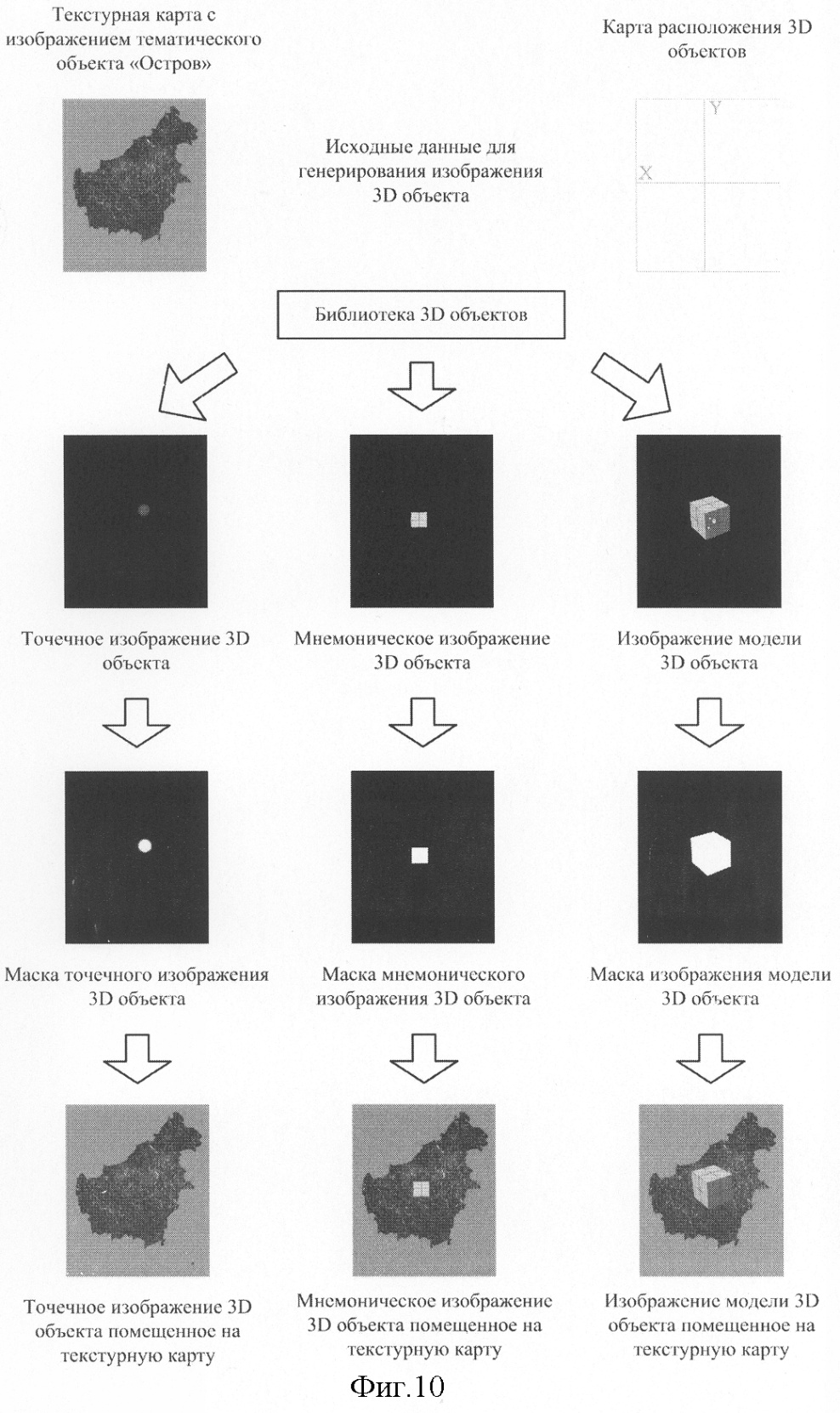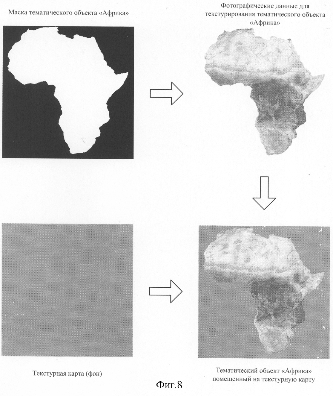 Кроме того, формирование, маскирование и изменение параметров каждого из тематических объектов осуществляется путем формирования маски тематического объекта, подготовки тематических данных или фотоданных тематического объекта, текстурирования тематического объекта по маске и наложения тематического объекта на текстурную карту.