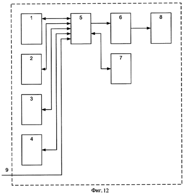 Устройство для реализации предлагаемого способа генерирования текстуры в реальном масштабе времени (см. фиг.12) содержит средства хранения данных 1, средства определения зоны видимости 2, средства обработки тематических объектов 3, средства генерирования изображений 3D объектов 4, микропроцессор 5, видеоинтерфейс 6, средства временного хранения текстурной карты 7, видеомонитор 8, информационный вход 9.