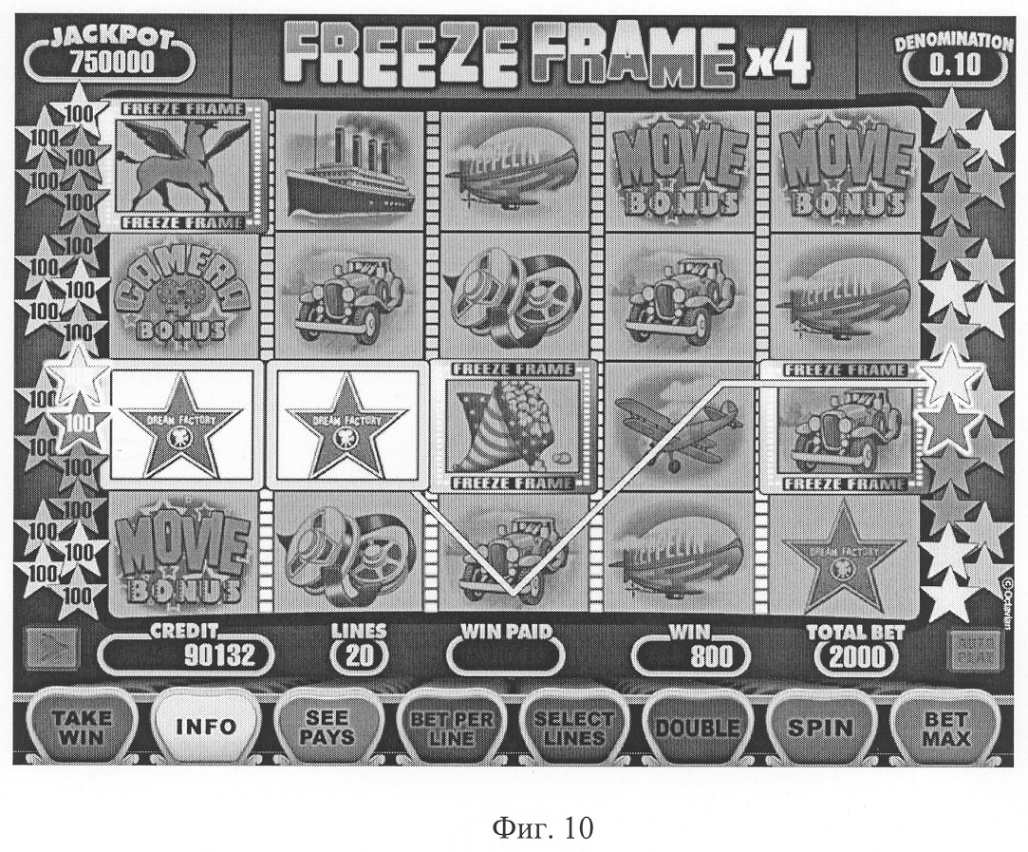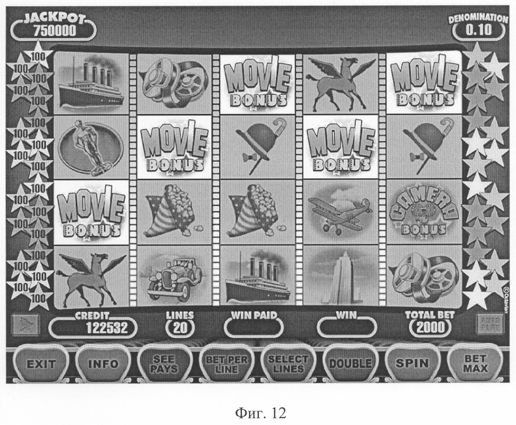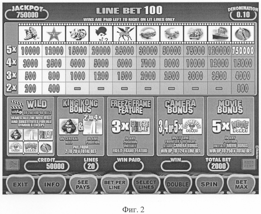 Игра начинается с установки на игровом автомате кредита в соответствии с суммой, внесенной игроком, который отображается на графическом дисплее 1 на индикаторе 2 “CREDIT” (кредит, фиг.1). Сумма может быть внесена игроком с помощью банкнотоприемника 33 или кредит может быть установлен обслуживающим персоналом, имеющим доступ к операции установки кредита. Доступ осуществляется с помощью устройства 32 для считывания магнитных карт либо с помощью электромеханического ключа 35. Затем игрок, нажимая на кнопку 3 “SELECT LINES” (выбор линий), выбирает количество игровых линий (от 1 до 20), которое отображается на индикаторе 4 “LINES”. При этом на каждую выбранную игровую линию автоматически устанавливается ставка, равная единице. Для увеличения ставки на каждую выбранную игровую линию игрок нажимает на кнопку 5 “BET PER LINE” (ставка на линию). Максимальное значение ставки на каждую выбранную игровую линию равно 100, суммарная ставка на игру отображается на индикаторе 6 “TOTAL ВЕТ” (общая ставка). Расположение выбранных игроком активных игровых линий также отображается на экране дисплея 1 игрового автомата. Процессор 26 системного блока 25 в зависимости от ставок генерирует команду сделать соответствующие игровые линии активными. В примере, представленном на фиг.1, можно играть одновременно на 20 игровых линиях при ставке на каждую игровую линию, равной 100. При этом общая ставка, равная 2000, отображается на индикаторе 6 “TOTAL BET”. После выбора игровых линий включением кнопки 7 “SPIN” (запуск барабанов) или кнопки 8 “BET MAX” (установка максимальной ставки и запуск барабана) запускают вращение видеобарабанов 9, 10, 11, 12, 13. При первом запуске игры включается режим основной игры. Затем под управлением процессора 26 осуществляется выбор результатов в режиме основной игры и остановка вращения пяти видеобарабанов 9, 10, 11, 12, 13 на выбранных позициях. Отображение результатов в режиме основной игры осуществляют с помощью дисплея 1, содержащего пять вращающихся видеобарабанов 9, 10, 11, 12, 13, на каждом из которых отображено множество различных символов. Первоначально определяют, не содержит ли результат основной игры переход из режима основной игры в режим первой призовой игры, обозначенный как “Movie Bonus” или режим второй призовой игры, обозначенный как “Camera Bonus”.