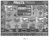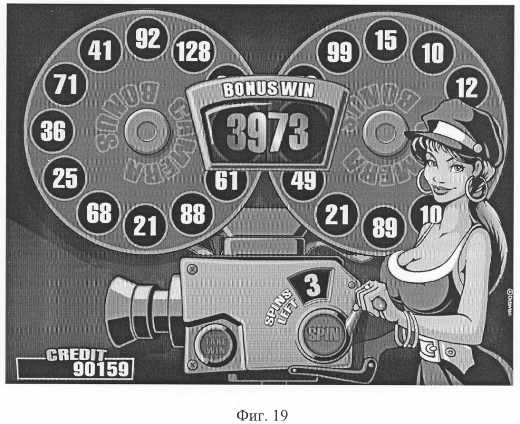 Перевод процессора 26 из режима основной игры в режим второй призовой игры “Camera Bonus” осуществляют при отображении в режиме основной игры, по крайней мере, на одной из активных игровых линий соответствующих результатов, заранее определенных для перевода процессора из режима основной игры в режим второй призовой игры. Причем результат перехода представляет собой соответствующую комбинацию, по крайней мере, из трех одинаковых символов, заранее определенных для второй призовой игры. В нашем примере таким результатом является комбинация из четырех символов “Camera Bonus”, отображенная на первой активной игровой линии (фиг.18). На экране дисплея 1 отображается киноаппарат с двумя бобинами (фиг.19). Кнопкой “Spin”, расположенной на сенсорном экране 24 графического дисплея 1, игрок запускает вращение бобин киноаппарата. По окончании каждого раунда и остановки вращения бобин на индикаторе в центре бобин образуется выигрыш, составляющий двух – пятизначное число (фиг.19). По окончании каждого раунда предоставляется возможность нажатием игроком кнопки “Take Win”, отображаемой на сенсорном экране 24 графического дисплея 1, окончания второй призовой игры и получения текущего призового выигрыша. Если игрок решает продолжить вторую призовую игру, то он нажимает кнопку “Spin”, при этом призовой выигрыш, полученный в предыдущем раунде, аннулируется. Призовой выигрыш, полученный в режиме второй призовой игры, удваивается, если в режиме основной игры результат перехода в режим второй призовой игры представляет собой отображение одновременно на двух активных игровых линиях соответствующих комбинаций, по крайней мере, из трех одинаковых символов “Camera Bonus”, заранее определенных для режима второй призовой игры. Результатом, вызывающим окончание режима второй призовой игры, является реализация игроком всех попыток получения призовых выигрышей, причем количество попыток во второй призовой игре определяется количеством одинаковых символов “Camera Bonus”, вызывающих переход из основной игры во вторую призовую игру. Результатом, вызывающим окончание режима второй призовой игры, является получение максимально возможного призового выигрыша. В режиме второй призовой игры вероятность выпадения выигрыша, представляющего собой двухзначное число, составляет 0,005%, трехзначное число – 0,0025%, четырехзначное число – 0,00175, пятизначное число – 0,00075%. Перевод процессора в режим второго мини-бонуса осуществляют при отображении в режиме основной игры на дисплее 1 на 9 (первом), 11 (третьем) и 13 (пятом) барабанах соответствующих результатов (символов “Freeze Frame”), заранее определенных для перевода процессора из режима основной игры в режим второго мини-бонуса (фиг.9). В режиме второго мини-бонуса предварительно фиксируют местоположение символов “Freeze Frame”, вызывающих переход в режим второго мини-бонуса, расположенных на первом, третьем и пятом барабанах, отмечая их рамками, затем осуществляют запуск барабанов в основной игре до тех пор, пока на фиксированных местах соответствующих барабанов, отмеченных рамками, не появятся три одинаковых символа из первой или второй групп символов, представляющих собой выигрышную комбинацию символов из первой и второй групп символов (фиг.11). На фиг.10 показан промежуточный результат, когда на фиксированных местах в рамках находятся неод