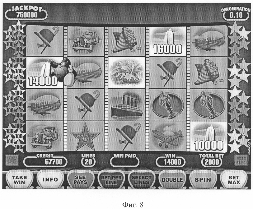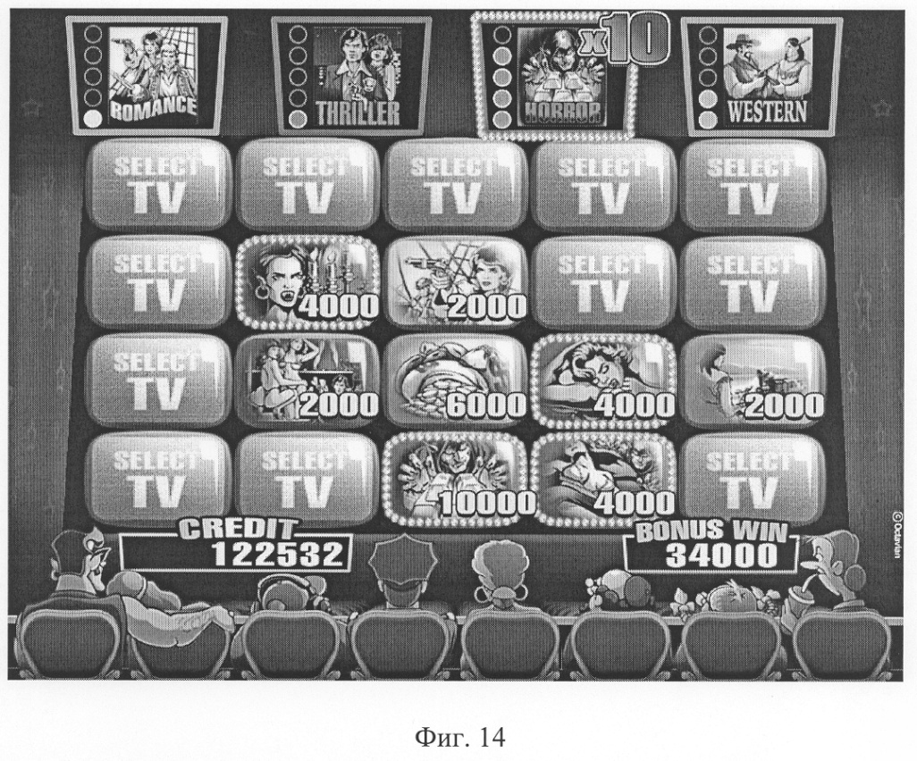 При отсутствии такого результата перехода определяют, не содержит ли один из результатов основной игры отображения на дисплее 1 комбинации, по крайней мере, из трех символов, заранее определенных для режима первого мини-бонуса, вызывающей перевод процессора 26 из режима основной игры в режим первого мини-бонуса, причем неодинаковый символ расположен на центральном барабане, а, по крайней мере, два одинаковых символа расположены на любых из оставшихся барабанах. В нашем примере результатом, приводящим к переводу процессора 26 из режима основной игры в режим первого мини-бонуса, является отображение комбинации, из четырех символов, причем неодинаковый символ, представляющий собой персонаж “Кинг-Конг”, расположен на центральном барабане 11, а три остальных одинаковых символа “небоскреба” (фиг.7), расположены на 9 (первом), 12 (четвертом) и 13 (пятом) барабанах, при этом выделены подсветкой на сенсорном экране 24 дисплея 1 все три одинаковых символа (небоскреба), а также неодинаковый символ в виде персонажа (“Кинг-Конг”). Каждый раз при выпадении такой комбинации режим основной игры переходит в режим первого мини-бонуса. Неодинаковый символ представляет собой персонаж (“Кинг-Конг”), который под управлением процессора 26 осуществляет перемещение с центрального барабана 11 к одному из одинаковых символов (“небоскребов”), расположенному, например, на 9 (первом) барабане, содержащему скрытый выигрыш и предварительно выбранному игроком, из трех одинаковых символов (“небоскребов”). Скрытый выигрыш в режиме первого мини-бонуса открывается по завершении перемещения символа, представляющего собой персонаж “Кинг-Конг” к одному из одинаковых символов (“небоскребов”), предварительно выбранных игроком, из трех одинаковых символов (фиг.8). Количество одинаковых символов (“небоскребов”), одновременно присутствующих на экране дисплея 1, может быть от 2-х до 4-х символов. В примере, приведенном на фиг.8, выигрыш составляет 14000, при этом высвечиваются все невыбранные символы и указанные на них скрытые выигрыши, а также символ, выбранный игроком путем прикосновением к сенсорному экрану дисплея 1, на котором указан конечный результат. Вероятность выпадения комбинации, по крайней мере, из трех символов (“Кинг-Конг”, “2 небоскреба”), приводящей к переводу процессора 26 в режим первого мини-бонуса, составляет в среднем 0,01%.