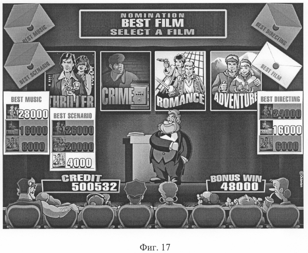Перевод процессора 26 в режим первой призовой игры осуществляют при отображении в режиме основной игры на видимом поле барабанов результата, представляющего собой комбинацию из пяти одинаковых символов, заранее определенных для перевода процессора из режима основной игры в режим призовой игры. В нашем примере таким результатом является комбинация из пяти символов “Movie bonus”, отображенная на видимом поле барабанов (фиг.12). Режим первой призовой игры содержит две независимых игры, причем каждый раз при получении комбинации из пяти одинаковых символов “Movie bonus” разыгрывается одна из игр, при этом выбор игры происходит случайным образом. В первой из независимых игр (Collect film) игрок под управлением процессора 26 осуществляет прикосновением к сенсорному экрану 24 графического дисплея 1 предварительный выбор одного из четырех одинаковых символов, являющегося указателем для получения максимально возможного выигрыша. В нашем примере такими символами-указателями являются 4 афиши с названиями жанров фильмов (фиг.13). Всего в игре возможны 6 жанров фильмов: Romance, Thriller, Western, Crime, Horror, Adventure, причем каждый раз при входе в игру случайным образом выбираются 4 жанра. После выбора игроком одной из афиш рамка вокруг нее выделяется подсветкой и на ней отображается максимально возможный множитель, равный 10. В каждом раунде первой независимой игры режима первой призовой игры игрок под управлением процессора 26 осуществляет выбор одного из символов, содержащего один из возможных результатов игры. В нашем примере такими символами, содержащими результаты игры, являются экраны с надписями “Select TV” (4 ряда телевизионных экранов, содержащих 5 экранов в каждом ряду), отображенные на фиг.14. Игрок осуществляет выбор символов (экранов) путем прикосновения к этим экранам. При этом каждый раз открывается кадр одного из четырех представленных на афишах фильмов, на котором указана сумма выигрыша, при этом открытый кадр и сумма выигрыша выделяются подсветкой, а на соответствующей афише подсвечивается один индикатор. Полученные выигрыши суммируются на индикаторе “BONUS WIN”. Моментом окончания первой независимой игры режима первой призовой игры и перехода в режим основной игры является накопление определенного количества однотипных символов (пяти кадров одного фильма). Один из возможных результатов первой независимой игры режима первой призовой игры представляет собой выигрыш, равный сумме выигрышей за все символы, выбранные игроком, если накопленные символы (пять кадров одного фильма) не совпадают с символом, предварительно выбранным игроком в качестве указателя для получения максимально возможного выигрыша. Один из возможных результатов первой независимой игры режима первой призовой игры представляет собой максимальный выигрыш, равный произведению суммы выигрышей за все символы, выбранные игроком и множителя, равного 10, если накопленные символы (пять кадров одного фильма) совпадают с символом, предварительно выбранным игроком в качестве указателя для получения максимального выигрыша (фиг.15, 16). Вероятность выпадения первой независимой игры режима первой призовой игры составляет 0,0009%. Во второй из независимых игр (Nomination Night) перед началом каждого из раундов игрок прикосновением к одному из символов (афише с фильмом), отображаемых на сенсорном экране г