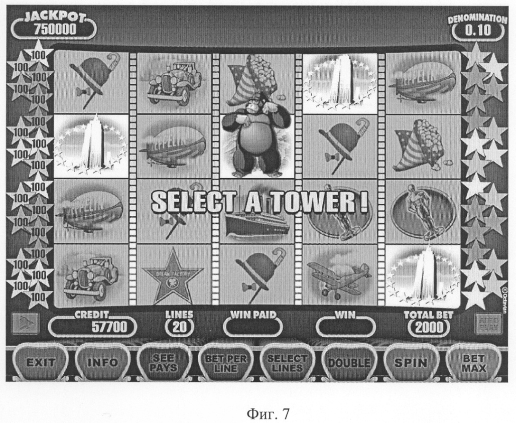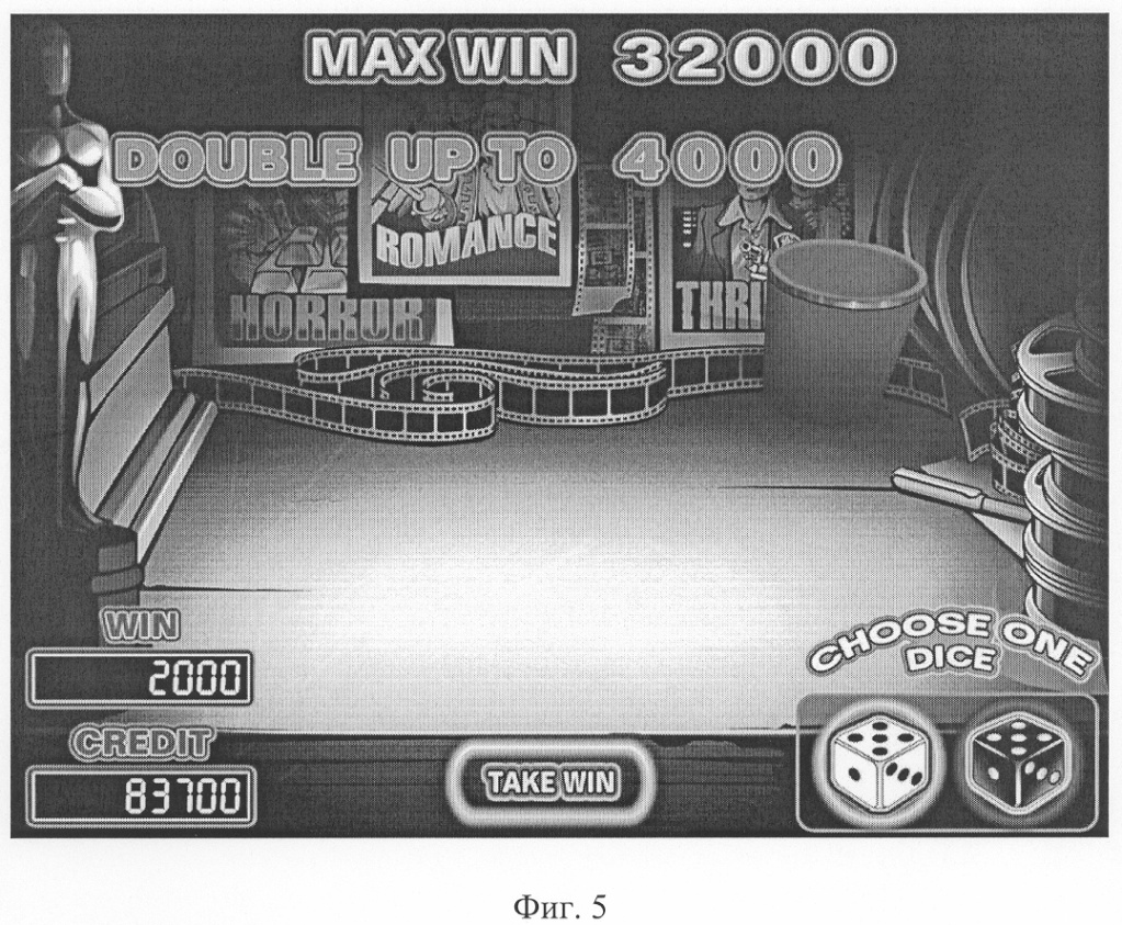 Затем определяют, не содержат ли результаты основной игры отображения выигрышных комбинаций на всех активных игровых линиях, начиная с первой, при этом выигрышная комбинация характеризуется отображением на любой из активных игровых линий, по крайней мере, двух одинаковых символов, расположенных подряд, начиная с крайнего левого барабана, и выбранных из первой группы заранее определенных для основной игры символов. В нашем примере такими символами являются “звезда”, “Оскар” и “попкорн”. При наличии нескольких выигрышных комбинаций выигрыши по всем этим комбинациям суммируются и отображаются на индикаторе 14 “WIN”. На фиг.3 представлен пример выигрышной комбинаций из двух одинаковых символов (“звезда”), расположенных подряд на десятой активной игровой линии. При начислении выигрыша за выигрышную комбинацию, по крайней мере, из двух одинаковых символов, выбранных из первой группы заранее определенных для основной игры символов, умножают сумму выигрыша, соответствующего полученной выигрышной комбинации (фиг.2), на величину ставки, установленной на линии, что составляет 400 (фиг.3). Выигрышная комбинация в основной игре возможна также при отображении на любой из активных игровых линий результата, представляющего собой комбинацию, по крайней мере, из трех одинаковых символов, расположенных подряд, и выбранных из второй группы заранее определенных для режима основной игры символов. Такими символами являются: “бобины”, “Чаплин”, “Пегас”, “дирижабль”, “самолет”, “автомобиль” и “корабль”. При наличии нескольких выигрышных комбинаций выигрыши по всем этим комбинациям суммируются и отображаются на индикаторе 14 ” WIN “. На фиг.3 отображен пример выигрышной комбинации из четырех одинаковых символов (“дирижаблей”), расположенных подряд на третьей активной игровой линии и выбранных из второй группы заранее определенных для режима основной игры символов, причем выделена подсветкой на сенсорном экране 24 дисплея 1 вся выигрышная комбинация из четырех символов (“дирижаблей”). При начислении выигрыша за выигрышную комбинацию из четырех одинаковых символов, выбранных из второй группы заранее определенных для режима основной игры символов, умножают сумму выигрыша, соответствующего полученной выигрышной комбинации (фиг.2) на величину ставки, установленной на линии, что составляет 7000 (фиг.3). После каждого результата, представляющего собой выигрышную комбинацию, полученную в режиме основной игры, предоставляется возможность нажатием кнопки 16 “DOUBLE” на сенсорном экране 24 дисплея 1 перевода процессора 26 в режим удвоения полученного выигрыша, если сумма полученного выигрыша меньше определенной заранее заданной суммы, равной 2000. Если игрок выбирает игру в режиме удвоения, он нажимает кнопку 16 “DOUBLE” (фиг.1), отображаемую на сенсорном экране 24 графического дисплея 1. После нажатия кнопки управления 16 “DOUBLE” процессор 26 осуществляет переход из режима основной игры в режим удвоения. На фиг.5 представлено изображение, соответствующее началу режима удвоения полученного в основной игре выигрыша, в котором игрок под управлением процессора 26 осуществляет предварительный выбор одного из двух символов, выполненных в виде игровых элементов (черного или белого), участвующих в розыгрыше и отображаемых на экране дисплея 1 под надпись