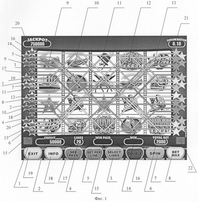В соответствии с чертежом (фиг.1) для осуществления способа игровой автомат содержит графический дисплей 1 с сенсорным экраном 24, на котором изображены следующие кнопки управления игрой: 3, 5, 7, 8, 16,17, 18, 19, 22. Игрок вводит команды путем прикосновения к сенсорному экрану 23 дисплея 1 в местах, где на дисплее расположены указанные выше кнопки управления игрой. Кроме того, в процессе выполнения различных призовых режимов работы игрок самостоятельно осуществляет выбор различных символов прикосновением к изображению символа в любом месте сенсорного экрана 24, поэтому конечные результаты в таких режимах напрямую зависят от выбора игрока, а не от заранее заданной программы. Кроме того, сенсорный экран 24 дисплея 1 обладает свойством подсветки, что позволяет в каждом режиме работы как в процессе его выполнения, так и при получении конечного результата, визуально подтвердить достоверность факта выбора игроком определенного символа или достоверность получения конечного результата в виде комбинации символов или числового результата, так как каждый выбранный игроком символ высвечивается на сенсорном экране 24 дисплея 1 и учитывается процессором 26 при формировании выигрышной комбинации или конечного результата. Игровой автомат содержит также индикаторы 2, 4, 6, 14, 15, 20, 21 и пять игровых видеобарабанов 9, 10, 11, 12, 13, отображающих множество символов на каждом из вращающихся видеобарабанов, а также активные игровые линии, на которых определяют выигрышные комбинации, которые засчитываются на активных игровых линиях слева направо, начиная с крайнего левого барабана. Игровой автомат (фиг.20) содержит также системный блок 25, контроллер периферийных устройств 31 устройство 32 для считывания информации с магнитных карт, банкнотоприемник 33, акустическую систему 34 и электромеханический ключ 35. Системный блок 25 включает в себя процессор 26, видеоконтроллер 27, блок для хранения программной информации 28, блок оперативной памяти 29, контроллер звука 30.