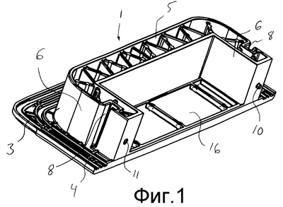 Также промежуточный модуль 2 имеет центральную часть 17 между боковыми перегородками 9, выполняющую функцию защитного средства при транспортировке. Указанная центральная часть 17 снимается при введении одного или более кабелей, трубок и т.п. Для облечения снятия центральной части 17 обычно используются указатели разрывов. Это также относится и к центральной части 16 концевого модуля 1.