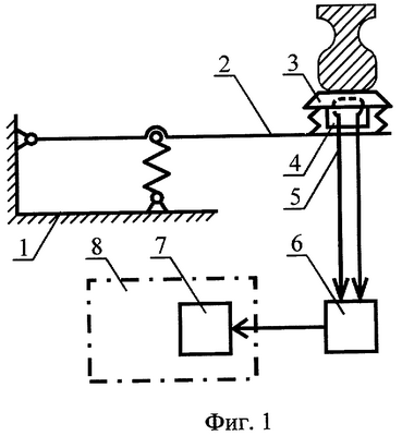При включении машинистом токоприемника поворотная штанга 2 поднимается и вводит в контакт с токопроводом токосъемный элемент 3, оснащенный датчиком 4 предельного износа. Датчик 4 выполнен в виде оптоволоконной линии 5, расположенной внутри токосъемного элемента 3 на расстоянии предельно допустимого износа от рабочей поверхности и связанной через усилитель 6 с блоком индикации 7 предельного износа, установленным на пульте машиниста 8. Таким образом, в качестве носителя информации используется оптический сигнал, передающийся от светодиода к фототранзистору, которые установлены в усилителе 6. При исправном состоянии контактного элемента 3 оптический сигнал, проходящий через оптоволоконную линию 5, поступает на усилитель 6. При износе контактного элемента 3, равном предельно допустимому, происходит перетирание (разрушение) оптоволоконной линии 5, вмонтированной в указанный элемент, при этом в цепи “датчик предельного износа – усилитель” прекращается подача оптического сигнала, при этом усилитель 6 выдает информацию на блок индикации 7 предельного износа, установленный на пульте машиниста 8 (например, горит лампа красного цвета). Машинист при этом обязан принять решение, так как пропадание сигнала в оптоволоконной линии может свидетельствовать не только о превышении износа более чем допустимого, но и о нарушении целостности конструкции самого токоприемника, срыве или изломе его токосъемного элемента 3.