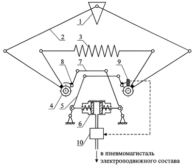 При включении токоприемника машинист подает сжатый воздух в пневмоцилиндр 6, который разводит в стороны рычаги 5. Последние с помощью тяг 7 отводят поворотные шарниры 8 от главных валов 4. Подвижные рамы 2 с полозом 1 начинают подниматься за счет подъемного упругого элемента 3 до момента касания контактного провода. При этом датчик положения 9 поворотного шарнира 8 фиксирует величину его отклонения от главного вала 4 и подает управляющий сигнал на реле давления 10 для уменьшения давления сжатого воздуха в пневмоцилиндре 6. Давление уменьшается до достижения поворотным шарниром 8 заданного уровня, соответствующего возможности отслеживания полозом 1 изменения высоты контактного провода.