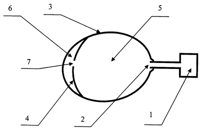 Поступивший газ от источника 1 газа внутрь камеры высокого давления 5 через входное отверстие 2 расправляет внешнюю оболочку, и подушка безопасности принимает рабочее положение для защиты человека. Внешняя поверхность оболочки 3 камеры низкого давления 6 контактирует с телом человека. Газ, поступивший внутрь камеры высокого давления 5 через отверстие 7 во внутренней перегородке 4, стравливается в камеру низкого давления 6. Диаметр отверстия 7 во внутренней перегородке подобран таким образом, чтобы в начальный момент времени касания расправившейся подушки с телом человека, обеспечить пониженное давление в камере 6 низкого давления, по сравнению с камерой 5 высокого давления. Через определенное время давление в обеих камерах низкого и высокого давления 6 и 5 сравняется. Таким образом тело человека, а особенно лицо в момент касания его с расправляющейся подушкой безопасности, получает смягченный удар, за счет более мягкой в начальный момент времени камеры 6 низкого давления.