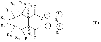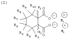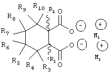 в которой M1 и М2, одинаковые или различные, выбраны из по меньшей мере одного катиона металла кальция, стронция, лития и моногидроксида алюминия, и в которой R1, R2, R3, R4, R5, R6, R7, R8, R9 и R10, одинаковые или различные, выбраны по отдельности из группы, включающей водород, C1-С9алкил, и два фрагмента карбокси расположены в виде цис-конфигурации, если катион металла является моногидроксидом алюминия. Термин «моногидроксид алюминия» хорошо известен и означает алюминиевую гидроксидную группу в виде одного катиона, связанную с двумя остатками карбоновой кислоты. Кроме того, у каждой из указанных возможных солей стереохимия асимметричных атомов углерода может иметь цис- или транс-форму, несмотря на то, что предпочтительной является цис-форма. Подробное описание изобретения Как указано выше, для того чтобы разработать нужную затравку для термопластов для промышленного применения, необходимо выполнить ряд важных требований. Соли кальция, стронция, моногидроксида алюминия и лития ННРА по изобретению отвечают всем данным важным требованиям. К примеру, указанные предлагаемые соединения не гидратируются с легкостью, таким образом, гранулированные или порошковые составы такой соли не агломерируются и не комкуются. Выгоды от такой устойчивости при хранении очевидны, поскольку почти отсутствует необходимость разделения агломерированных порошков при их подаче в оборудование для обработки термопластов. Кроме того, в соответствии с нижеприведенным подробным описанием, указанные предлагаемые соли обеспечивают высокие пиковые температуры кристаллизации различных полиолефиновых и полиэфирных композиций, в частности, статистического сополимера полипропилена (в дальнейшем обозначен как RCP), гомополимера полипропилена (в дальнейшем обозначен как HP), сополимера ударопрочного полипропилена (в дальнейшем обозначен как ICP), синдиотактического полипропилена (s-РР), полиэтилентерефталата (в дальнейшем обозначен как PET), полиамидов (таких как найлон) и любых их сочетаний. Кроме того, такие предлагаемые соли обеспечивают высокую жесткость (модуль) всего конечного полиолефинового продукта в целом без необходимости применения дополнительных наполнителей и упрочняющих агентов. И, наконец, что имеет важное значение для полипропиленовой промышленности, такие предлагаемые соли не вступают в нежелательное взаимодействие с содобавками из стеарата кальция. Такое свойство, в сочетании с другими характеристиками, является в высшей степени неожиданным и непредсказуемым. Таким образом, предлагаемые соединения обеспечивают высокую затравочную способность. Натриевые соли некоторых ароматических и циклоалифатических карбоновых кислот были описаны ранее, особенно в патенте США №3207739 на имя Wales. В широком смысле патентовладелец включает металлические соли ряда подобных соединений, в частности натрия, хотя также широко описаны металлы групп I и II. Однако патентовладелец конкретно указывает, что ароматические бензоаты, в частности, бензоат натрия, представляют собой наилучшие соединения для затравки полиолефина. Более того, патентовладелец упоминает стронций в качестве катиона только для бензоата, в частности, предупреждая о нежелательности применения солей кальция из-за трудностей, возникающих при тепловой обработке. Кроме того, патентовладелец урав