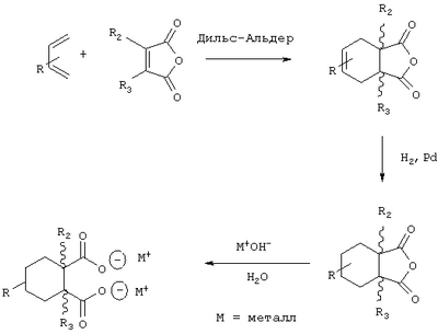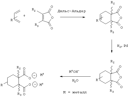 Где R=CH3, R2, R3=H Многие гексагидрофталевые ангидриды легко синтезируют по механизму реакции Дильса-Альдера. Данные замещенные производные ННРА, где R является переменным, легко получают, а затем превращают в металлические соли при использовании соответствующих гидроксидов металлов в водной среде. Типичная последовательность реакций продемонстрирована ниже: Конечная структура металлических солей ННРА зависит от того, какой был выбран замещенный бутадиен, а также от того какой замещенный малеиновый ангидрид использовали в синтезе Дильса-Альдера. Таким образом, предлагаемые соли ННРА добавляют к получаемому термопласту в количестве приблизительно от 0,01 до 2,0% мас., более предпочтительно, приблизительно от 0,2 до 1,5%, и, наиболее предпочтительно, от 0,05 до 1,0%, для того чтобы обеспечить вышеуказанные полезные свойства. До 50 и более процентов активного соединения могут быть также добавлены к маточной смеси, хотя это и не является обязательным. Необязательные добавки к предлагаемой солесодержащей композиции ННРА или к изготавливаемому из нее конечному термопластичному изделию могут включать пластификаторы, стабилизаторы, поглотители ультрафиолетовых лучей и другие подобные стандартные термопластичные добавки. Данная композиция может также включать другие добавки, особенно антиоксиданты, антимикробные агенты (например, соединения на основе серебра, предпочтительно, ионообменные соединения, такие как бактерицидные вещества ALPHASAN® от Milliken & Company), антистатические соединения, отдушки, поглотители хлора и т.п., пластификаторы, поглотители кислоты, антиоксиданты, бактерицидные добавки, антипирены, светостабилизаторы, антистатики, порообразователи, цветные пигменты, а также любое их сочетание. Указанные содобавки, наряду с затравочными агентами, могут присутствовать в виде примеси в порошковом, жидком или в прессованном/гранулированном виде с целью облегчения их загрузки. Желательным может оказаться применение веществ для улучшения диспергирования, таких как полиолефиновые (к примеру, полиэтиленовые) воски, сложные стеаратные эфиры глицерина, горные воски и минеральное масло. Как правило, предлагаемые металлические соединения ННРА для стандартной термопластичной композиции могут присутствовать (до 20% мас. или выше) в любом виде (к примеру, наиболее предпочтительно, полиолефин), включая, но не ограничиваясь ими, порошок, гранулы, агломерат, жидкую суспензию и т.п., особенно включая описанные выше вещества для улучшения диспергирования. Также могут быть использованы составы, получаемые в результате смешивания, агломерации, прессования и/или экструзии. Термин «полиолефин» или «полиолефиновая смола» означает любые материалы, включающие по меньшей мере один полукристаллический полиолефин. Предпочтительные примеры включают изотактический и синдиотактический полипропилен, полиэтилен, поли(4-метил)пентен, полибутилен, а также их любые смеси или сополимеры, независимо от того, является ли их плотность в составе высокой или низкой. Полиолефиновые полимеры в соответствии с настоящим изобретением могут содержать алифатические полиолефины и сополимеры, включающие по меньшей мере один алифатический олефин и один или несколько этилен-ненасыщенных сомономеров. В целом, сомономеры, при их использовании, присутствуют в небольшом 