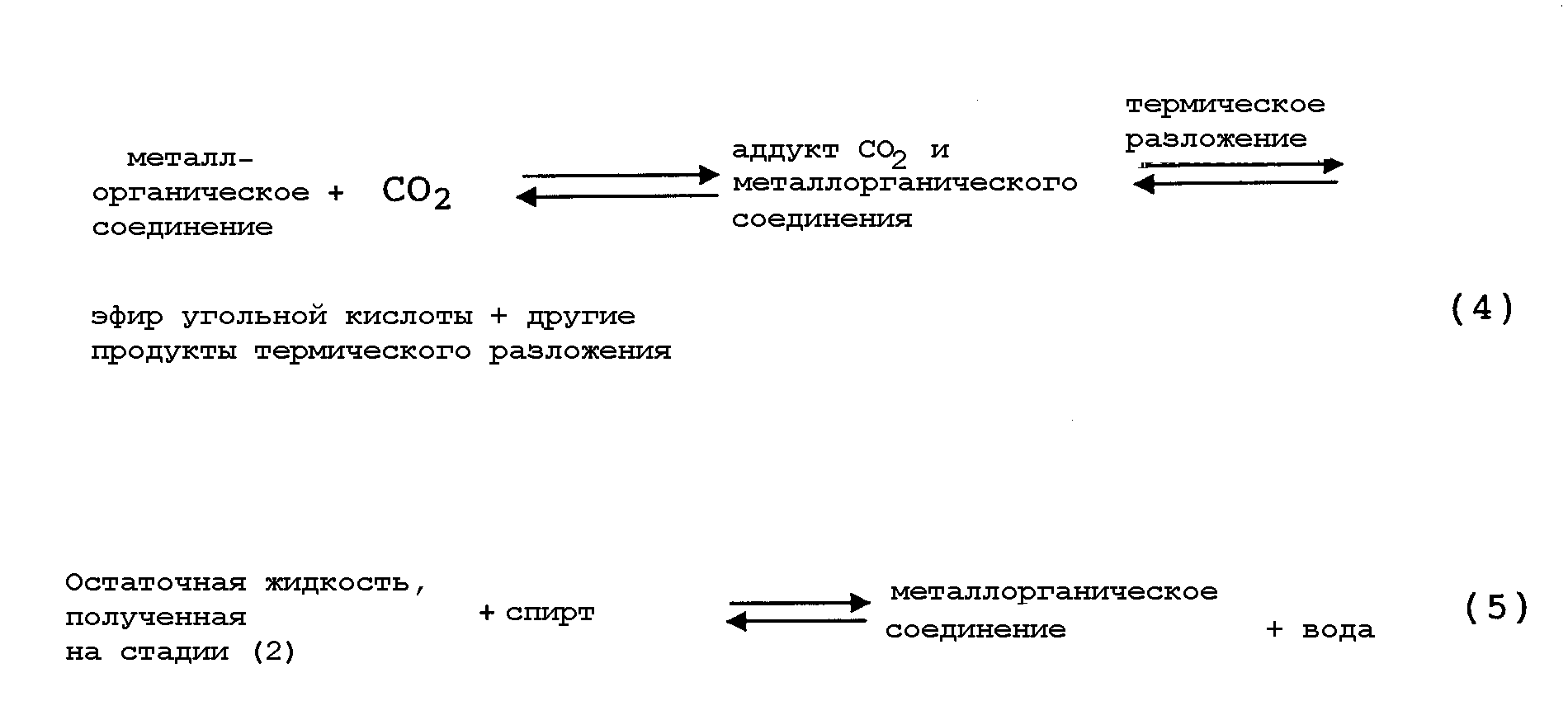 Для решения проблем, сопровождающих предшествующий уровень техники, заявители настоящего изобретения в публикации WO 03/055840 предложили новый способ получения эфира угольной кислоты. Существенным признаком нового способа является то, что в указанном способе используют реакционный путь, в котором органическое соединение, имеющее связь металл-кислород-углерод, используется в большом количестве в качестве предшественника эфира угольной кислоты, а не в качестве катализатора, и металлорганическое соединение вступает в реакцию присоединения с диоксидом углерода с образованием аддукта, после чего следует реакция термического разложения аддукта с получением в результате реакционной смеси, содержащей эфир угольной кислоты. Заявители настоящего изобретения установили, что этим способом эфир угольной кислоты может быть получен с высоким выходом. Большинство из приведенных выше проблем предшествующего уровня техники решено с помощью названного способа. Однако даже этот способ имеет проблему в том, что во время реакции образуется и накапливается в реакционной системе нерегенерируемое инертное металлорганическое соединение.