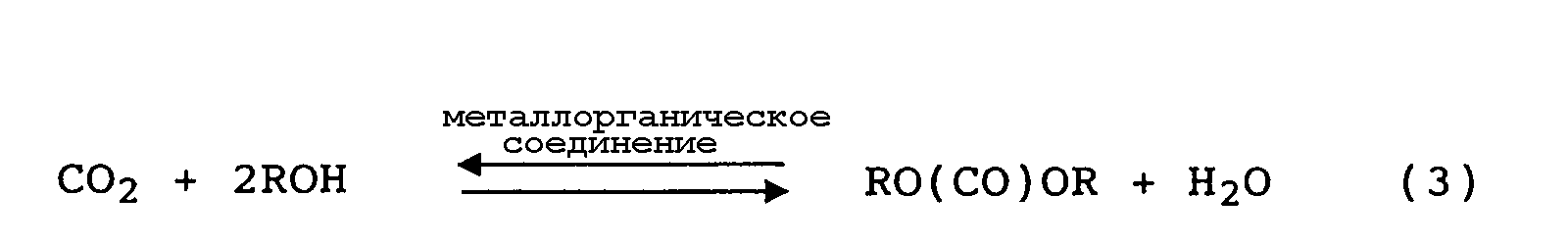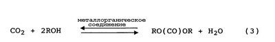 Также известен способ, по которому диоксид углерода, используемый в качестве источника карбонила, вступает в равновесную реакцию со спиртом в присутствии катализатора, содержащего металлорганическое соединение, имеющее связь металл-кислород-углерод, в результате чего образуется эфир угольной кислоты и вода. Такая равновесная реакция представлена следующим уравнением (3):