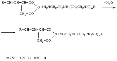 Изобретение относится к области нефтехимического синтеза, в частности к способу получения имидов алкенилянтарной кислоты, и может быть использовано в качестве моющей и диспергирующей присадки в составе смазочных масел для уменьшения образования углеродистых отложений на деталях двигателей внутреннего сгорания. Описан синтез сукцинимидных присадок взаимодействием алкенилянтарного ангидрида с аминами. Сукцинимиды получают в две стадии. На первой стадии малеиновый ангидрид реагирует при температуре 200-300°С с полиизобутиленом, образуя полиизобутиленянтарный ангидрид, который взаимодействует на второй стадии с полиамином (см. V. Kashmin || Chem.tech, 1990, 20, №4, с.242-247). Недостатком процесса получения сукцинимида является проведение синтеза на первой стадии при высокой температуре (200-300°С) и в результате чего наблюдается ухудшение качества алкенилянтарного ангидрида за счет частичного его разложения и образования побочных продуктов. Наиболее близким к заявленному по сущности является способ получения имидов алкенилянтарной кислоты взаимодействием алкенилзамещенной янтарной кислоты или ее ангидрида ( Недостатком известного способа является высокая температура 150-250°С на первой стадии и длительность процесса получения. Задача изобретения – разработка эффективного способа получения имидов алкенилянтарной кислоты – присадок для моторных масел и упрощения технологического процесса. Технический результат при использовании изобретения выражается в повышении производительности установки, интенсификации производства, упрощения технологического процесса и повышении качества продукции. Вышеназванный результат получения имидов алкенилянтарной кислоты- присадок для смазочных масел достигается способом получения алкенилсукцинимидов путем алкилирования малеинового ангидрида олефинами (с содержанием атомов углерода С10-30) с последующим взаимодействием алкенилянтарного ангидрида со смесью, содержащей полиэтиленполиамины в присутствии растворителя, особенность которого заключается в том, что алкилирование малеинового ангидрида проводят полиальфаолефинами молекулярной массой 750-1200 в присутствии инициатора сначала при температуре 60-100°С в течение 1-1,5 часов, с последующим повышением температуры до 160-170°С в течение 3-4 часов и выдержкой при 175-180°С в течение 0,5 часа в мольном соотношении полиальфаолефин: малеиновый ангидрид =1:1-1,1, с последующей конденсацией алкилированного малеинового ангидрида смесью, содержащей полиэтиленполиамины при 50-110°С в течение 1-1,5 часов с последующим нагреванием при 135-145°С в течение 3,5-4 часов в мольном соотношении алкилированный малеиновый ангидрид: смесь (полиэтиленполиамин) =1:1-1,1 в среде масла или ароматических углеводородов. Кроме того, особенность состоит в том, что в качестве полиэтиленполиамина используют преимущественно смесь триэтилентетрамина и тетраэтиленпентамина с содержанием 40-70% и 20-50 мас.% соответственно, в качестве инициатора используют перекись третичного бутила или метилэтилкетона в количестве 1-2% от веса исходных продуктов полиальфаолефина и малеинового ангидрида и в качестве масла и ароматических углеводородов используют индустриальное масло марки И-20А или И-40А (ГОСТ №20799-88 с изм.1-5), орто- или пара-ксилолы, или сольвенты (смесь ксилолов) (ТУ 6-09-3825-88, ТУ 38-101-255-87) соответств