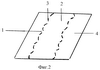 На фиг.4 показано расположение защитного элемента в бумаге 4 в случае, когда центральная недеформированная часть 2 шириной не менее 2,0 мм периодически выходит на поверхность, при этом длина “окна” составляет от 5,0 до 10,0 мм, расстояние между “окнами” составляет от 5,0 до 10,0 мм, а деформированные края 3 расположены на поверхности бумаги по всей длине нити 1.