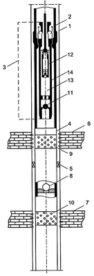 В стенках хвостовика 4 в зонах расположения пластов просверлены фильтрационные отверстия 9 и 10 для подачи продукции пластов к всасывающему основному клапану 11 насоса 3.