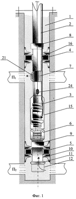 на фиг.1 – установка либо для непрерывной или периодической добычи скважинным насосом флюида из нижнего объекта П2 при изоляции верхнего объекта П1 (например, негерметичность ствола, водяной пласт и пр.), либо для внутрискважинной закачки, то есть для добычи скважинным насосом флюида (воды) из нижнего объекта П2 и частичной или полной ее закачки в верхний объект П1, либо же для периодической закачки среды с поверхности скважины в верхний объект П1 после остановки насоса и соответственно закрытия нижнего объекта П2;