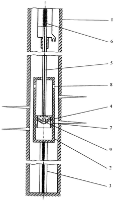 Сущность предлагаемого изобретения поясняется нижеследующим описанием и прилагаемым к нему чертежом, на котором: 1 – скважина; 2 – цилиндр; 3 – опора; 4 – плунжер; 5 – штанга; 6 – плунжер насоса-качалки; 7 – окна плунжера; 8 – окна цилиндра; 9 – обратный клапан.